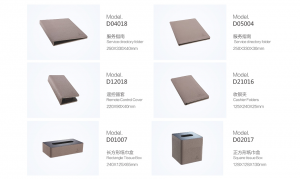 PRODUCTS:GUEST SERVICE DIRECTORY, NOTE PAD HOLDER, LEATHER TISSUE BOX HOLDER, LEATHER TISSUE BOX HOLDER, LEATHER ICE BUCKET, LEATHER REMOTE CONTROLLER HOLDER, LEATHER ALARM CLOCK,