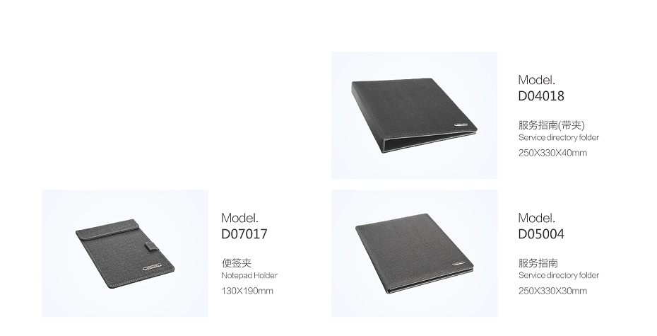 PRODUCTS:LEATHER FOLDER, LEATHER SERVICE DIRECTORY (WITH CLIPS), LEATHER RECTANGLE TISSUE BOX HOLDER, SQUARE TISSUE BOX HOLDER, LEATHER REMOTE CONTROLLER STAND & FOLDER, LEATHER TEA BOX, LEATHER SHOE TRAY, LEATHER CASHIER FOLDER, LEATHER BLOTTER, LEATHER AMENITY BOX, LEATHER STATIONARY BOX, NOTEPAD HOLDER, LEATHER DOOR KNOB (DO NOT DISTURB), LEATHER CONFERENCE PAD, LEATHER CUP MAT, LEATHER ICE BUCKET, LEATHER DUST BIN