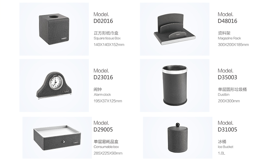 PRODUCTS:LEATHER GUEST SERVICE DIRECTORY, LEATHE NOTE PAD HOLDER, LEATHER RECTANGLE TISSUE BOX COVER, SQUARE TISSUE BOX COVER, LEATHER REMOTE CONTROLLER HOLDER, LEATHER REMOTE CONTROLLER STAND, LEATHER CHECK BILL FOLDER, LEATHER CONFERENCE CUP STAND, LEATHER NAME CARD HODLER, LEATHER AMENITY TRAY, LEATHER ASH TRAY HOLDER, LEATHER BLOTTER, LEATHER TEA BOX, LEATHER MAGAZINE RACK, LEATHER ALARM CLOCK, LEATHER METAL DOUBLE WALL DUST BIN