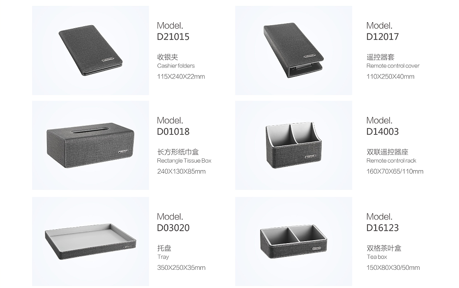 PRODUCTS:LEATHER FOLDER, LEATHER NOTE PAD HOLDER, LEATHER RECTANGLE TISSUE BOX HOLDER, SQUARE TISSUE BOX HOLDER, LEATHER CONFERENCE PAD, LEATHER BLOTTER, LEATHER REMOTE CONTROLLER HOLDER, LEATHER AMENITY TRAY, LEATHER SOAP DISH, LEATHER TOWEL DISPLAY, LEATHER TEA BOX, LEATHER MAGAZINE RACK