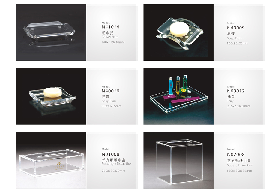 PRODUCTS:ACRYLIC SOAP DISH, ACRYLIC TOWEL TRAY, ACRYLIC DRINK HOLDER, ACRYLIC REMOTE CONTROLLER HOLDER, ACRYLIC TISSUE BOX COVER, ACRYLIC TRAY, ACRYLIC TEA BOX, ACRYLIC AMENITY BOX