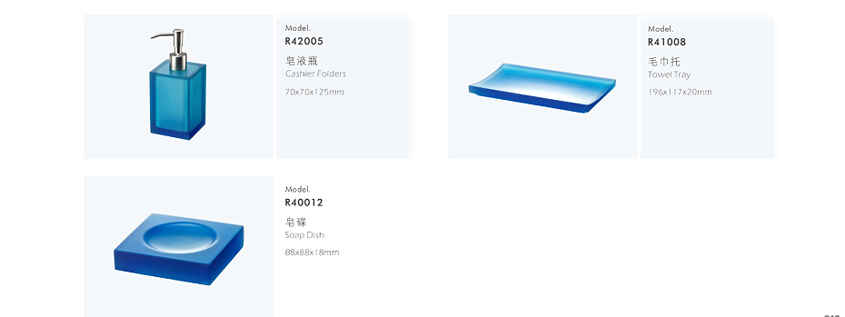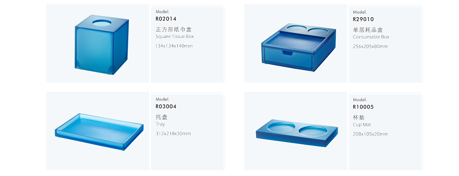 PRODUCTS:RESIN TISSUE BOX COVER, RESIN TRAY, RENSIN AMENITY BOX, RESIN SOAP DISPENSER, RESIN SOAP DISH, RESIN CUP MAT, RESIN DUST BIN, RESIN SERVICE TRAY