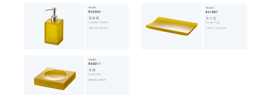 PRODUCTS:RESIN TISSUE BOX COVER, RESIN TRAY, RENSIN AMENITY BOX, RESIN SOAP DISPENSER, RESIN SOAP DISH, RESIN CUP MAT, RESIN DUST BIN, RESIN SERVICE TRAY