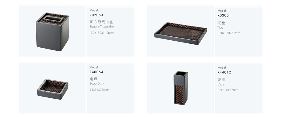 PRODUCTS:RESIN SERVICE DIRECTORY FOLDER, RESIN NOTEPAD BOX, RESIN RECTANGLE TISSUE BOX COVER, RESIN SQUARE TISSUE BOX COVER, RESIN AMENITY BOX, RESIN REMOTE CONTROLLER HOLDER, RESIN MOUTH CUP, RESIN AMENITY TRAY, RESIN SOAP DISH, RESIN SALT CUP, RESIN DUST BIN, RESIN CONSUMABLE BOX