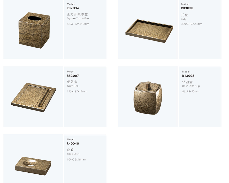 PRODUCTS:RESIN SERVICE DIRECTORY FOLDER, RESIN NOTEPAD BOX, RESIN RECTANGLE TISSUE BOX COVER, RESIN SQUARE TISSUE BOX COVER, RESIN AMENITY BOX, RESIN REMOTE CONTROLLER HOLDER, RESIN MOUTH CUP, RESIN AMENITY TRAY, RESIN SOAP DISH, RESIN SALT CUP, RESIN DUST BIN, RESIN CONSUMABLE BOX