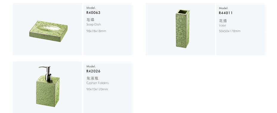 PRODUCTS:RESIN TISSUE BOX COVER, RESIN SOAP DISH, RESIN SOAP DISPENER, RESIN TOWEL DISH, RESIN AMENITY BOX