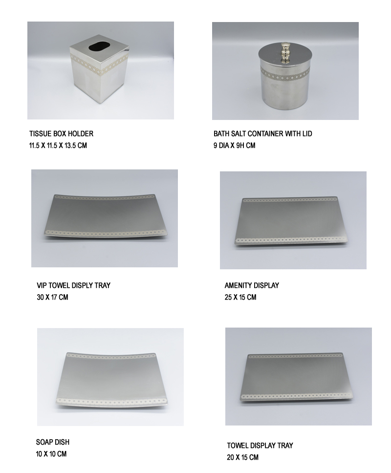 PRODUCTS:STAINLESS STEEL TISSUE BOX HOLDER, STAINLESS STEEL BATH SALT CONTAINER, STAINLESS STEEL TOWEL TRAY, S/S TOWEL DISPLAY, S/S AMENITY DISPLAY, S/S SOAP DISH