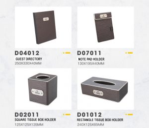 PRODUCTS:LEATHER FOLDER, LEATHER SERVICE DIRECTORY (WITH CLIPS), LEATHER RECTANGLE TISSUE BOX HOLDER, SQUARE TISSUE BOX HOLDER, LEATHER REMOTE CONTROLLER STAND & FOLDER, LEATHER TEA BOX, LEATHER SHOE TRAY, LEATHER CASHIER FOLDER, LEATHER BLOTTER, LEATHER AMENITY BOX, LEATHER STATIONARY BOX, NOTEPAD HOLDER, LEATHER DOOR KNOB (DO NOT DISTURB), LEATHER CONFERENCE PAD, LEATHER CUP MAT, LEATHER ICE BUCKET, LEATHER DUST BIN