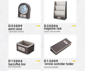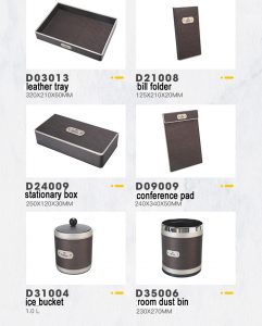 PRODUCTS:LEATHER GUESTROOM DIRECTORY, LEATHE NOTE PAD HOLDER, LEATHE SQUARE TISSEU BOX HOLDER, RECTANGLE TISSUE BOX HOLDER, LEATHER TRAY, LEATHER TEA BOX, LEATHER SHOE TRAY, LEATHER AMENITY TRAY, LEATHER MAGAZINE RACK, LEATHER ALARM CLOCK, LEATHE ICE BUCKET, LEATHER AMENITY BOX, LEATHER REMOTE CONTROLLER HOLDER, METAL DOUBLE WALL DUST BIN, LEATHER DUST BIN