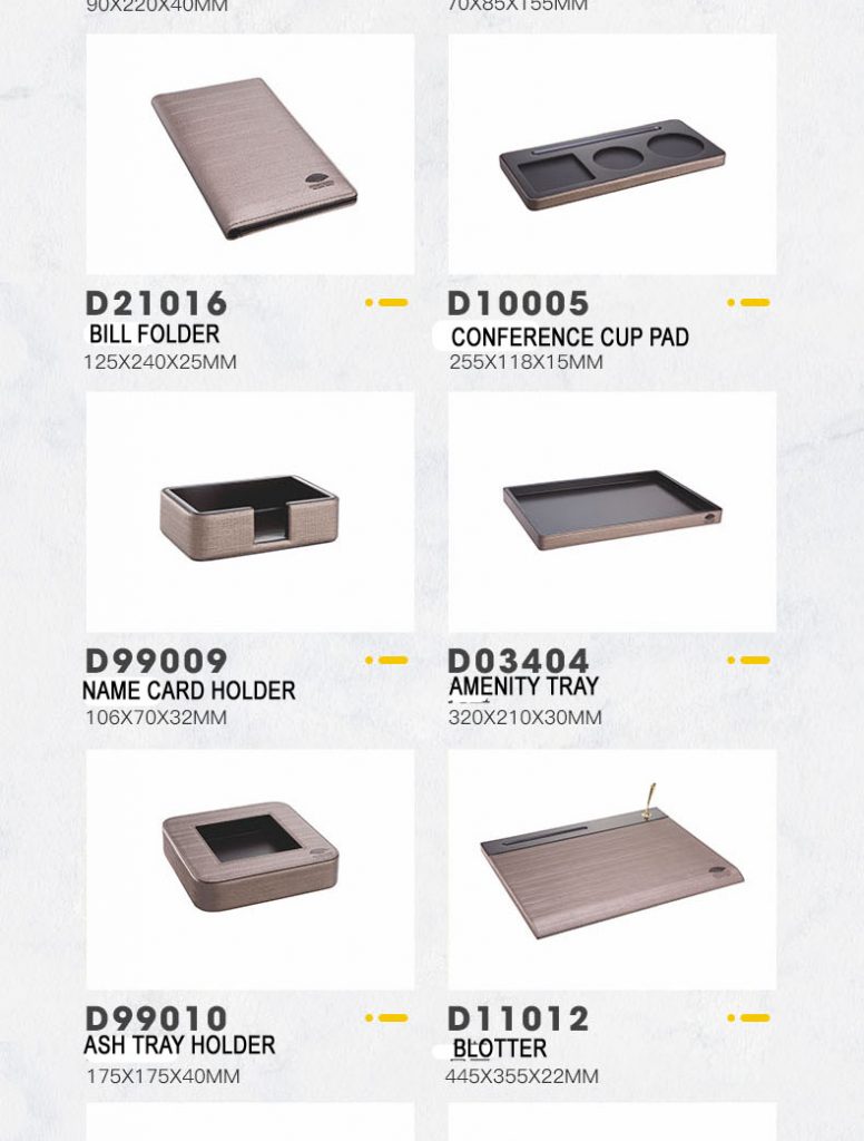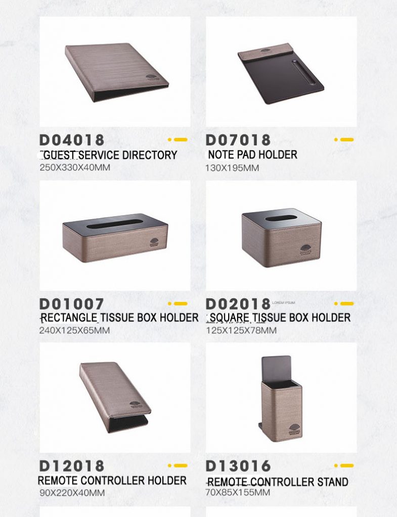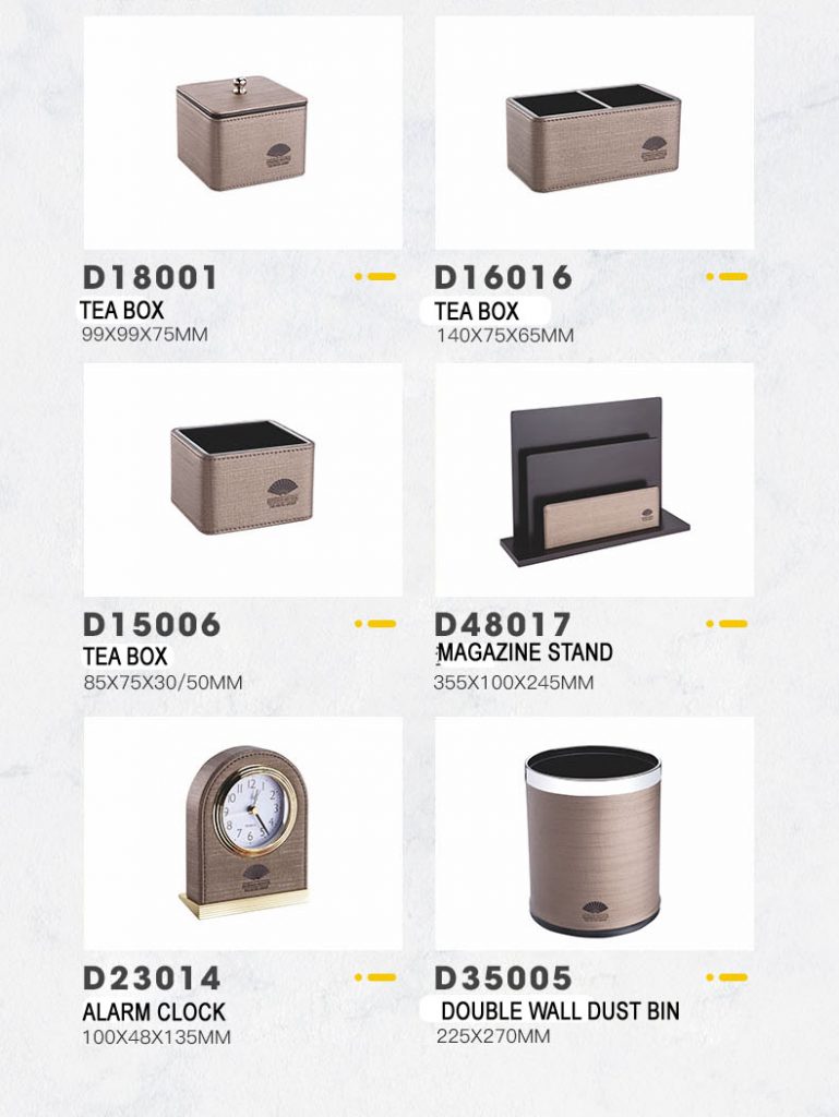 PRODUCTS:LEATHER GUESTROOM DIRECTORY, LEATHE NOTE PAD HOLDER, LEATHE SQUARE TISSEU BOX HOLDER, RECTANGLE TISSUE BOX HOLDER, LEATHER TRAY, LEATHER TEA BOX, LEATHER SHOE TRAY, LEATHER AMENITY TRAY, LEATHER MAGAZINE RACK, LEATHER ALARM CLOCK, LEATHE ICE BUCKET, LEATHER AMENITY BOX, LEATHER REMOTE CONTROLLER HOLDER, METAL DOUBLE WALL DUST BIN, LEATHER DUST BIN