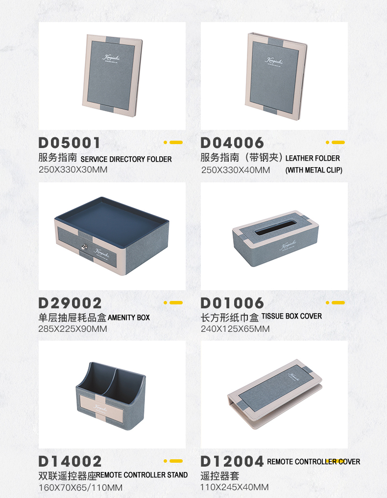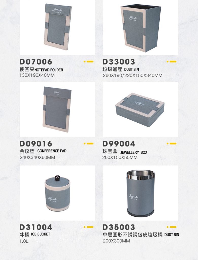PRODUCTS:LEATHER FOLDER, LEATHER SERVICE DIRECTORY (WITH CLIPS), LEATHER RECTANGLE TISSUE BOX HOLDER, SQUARE TISSUE BOX HOLDER, LEATHER REMOTE CONTROLLER STAND & FOLDER, LEATHER TEA BOX, LEATHER SHOE TRAY, LEATHER CASHIER FOLDER, LEATHER BLOTTER, LEATHER AMENITY BOX, LEATHER STATIONARY BOX, NOTEPAD HOLDER, LEATHER DOOR KNOB (DO NOT DISTURB), LEATHER CONFERENCE PAD, LEATHER CUP MAT, LEATHER ICE BUCKET, LEATHER DUST BIN