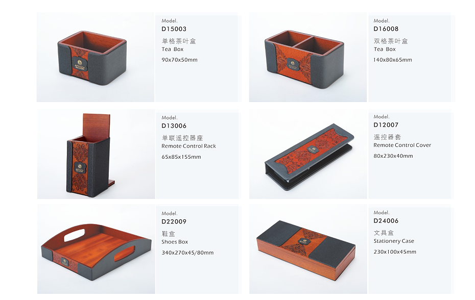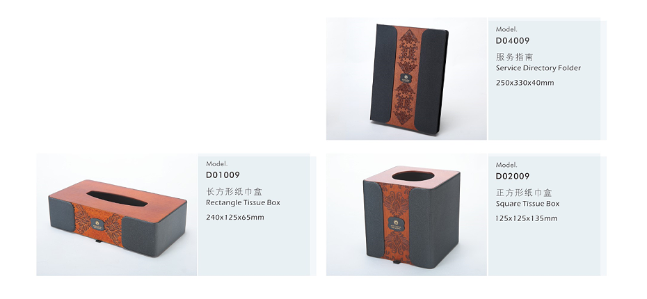 PRODUCTS:LEATHER FOLDER, LEATHER NOTE PAD HOLDER, LEATHER RECTANGLE TISSUE BOX HOLDER, SQUARE TISSUE BOX HOLDER, LEATHER CONFERENCE PAD, LEATHER BLOTTER, LEATHER REMOTE CONTROLLER HOLDER, LEATHER AMENITY TRAY, LEATHER SOAP DISH, LEATHER TOWEL DISPLAY, LEATHER TEA BOX, LEATHER MAGAZINE RACK