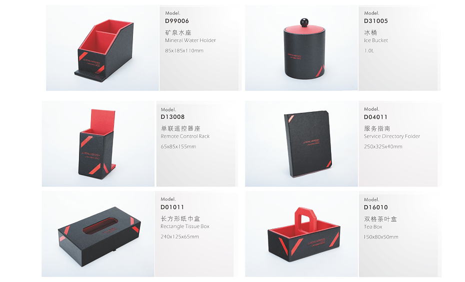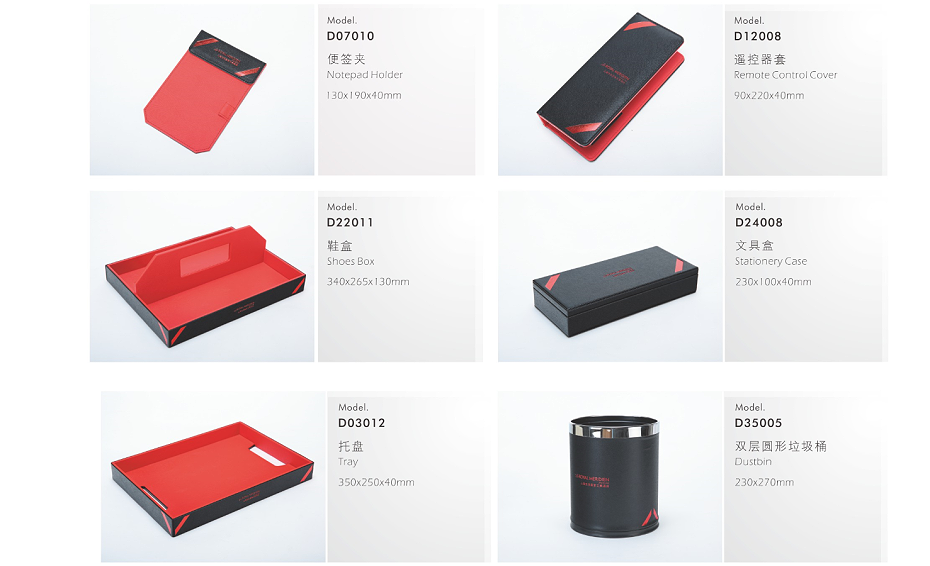 PRODUCTS:LEATHER GUESTROOM DIRECTORY, LEATHE NOTE PAD HOLDER, LEATHE SQUARE TISSEU BOX HOLDER, RECTANGLE TISSUE BOX HOLDER, LEATHER TRAY, LEATHER TEA BOX, LEATHER SHOE TRAY, LEATHER AMENITY TRAY, LEATHER MAGAZINE RACK, LEATHER ALARM CLOCK, LEATHE ICE BUCKET, LEATHER AMENITY BOX, LEATHER REMOTE CONTROLLER HOLDER, METAL DOUBLE WALL DUST BIN, LEATHER DUST BIN