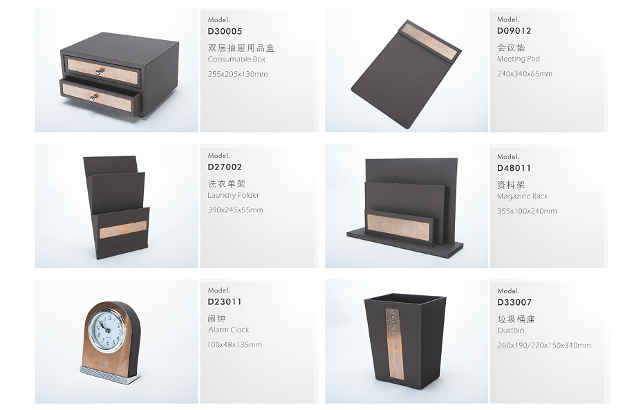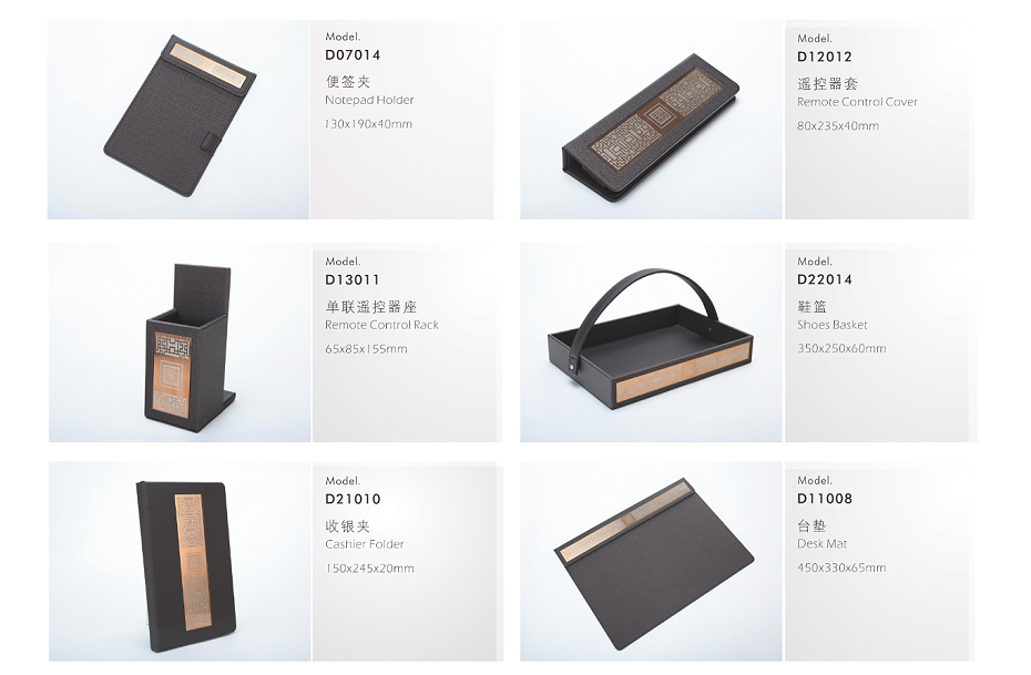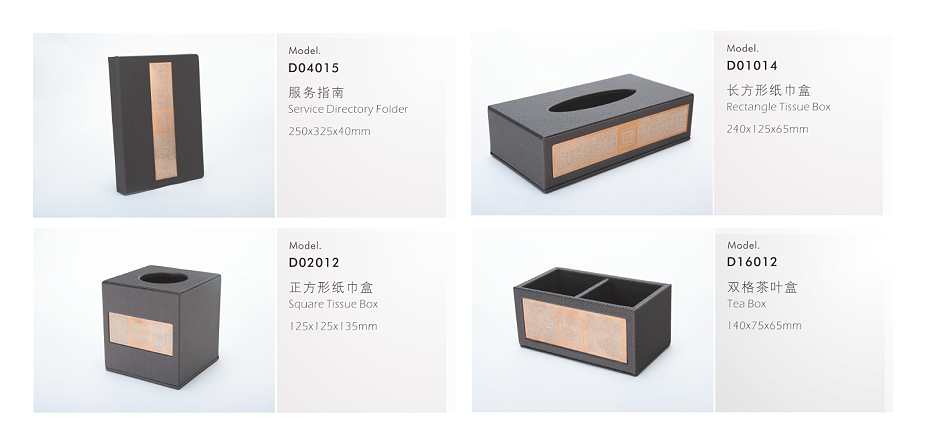 PRODUCTS:LEATHER GUESTROOM DIRECTORY, LEATHE NOTE PAD HOLDER, LEATHE SQUARE TISSEU BOX HOLDER, RECTANGLE TISSUE BOX HOLDER, LEATHER TRAY, LEATHER TEA BOX, LEATHER SHOE TRAY, LEATHER AMENITY TRAY, LEATHER MAGAZINE RACK, LEATHER ALARM CLOCK, LEATHE ICE BUCKET, LEATHER AMENITY BOX, LEATHER REMOTE CONTROLLER HOLDER, METAL DOUBLE WALL DUST BIN, LEATHER DUST BIN