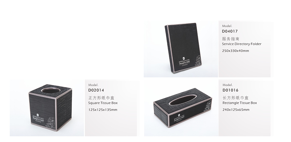 PRODUCTS:LEATHER FOLDER, LEATHER SERVICE DIRECTORY (WITH CLIPS), LEATHER RECTANGLE TISSUE BOX HOLDER, SQUARE TISSUE BOX HOLDER, LEATHER REMOTE CONTROLLER STAND & FOLDER, LEATHER TEA BOX, LEATHER SHOE TRAY, LEATHER CASHIER FOLDER, LEATHER BLOTTER, LEATHER AMENITY BOX, LEATHER STATIONARY BOX, NOTEPAD HOLDER, LEATHER DOOR KNOB (DO NOT DISTURB), LEATHER CONFERENCE PAD, LEATHER CUP MAT, LEATHER ICE BUCKET, LEATHER DUST BIN