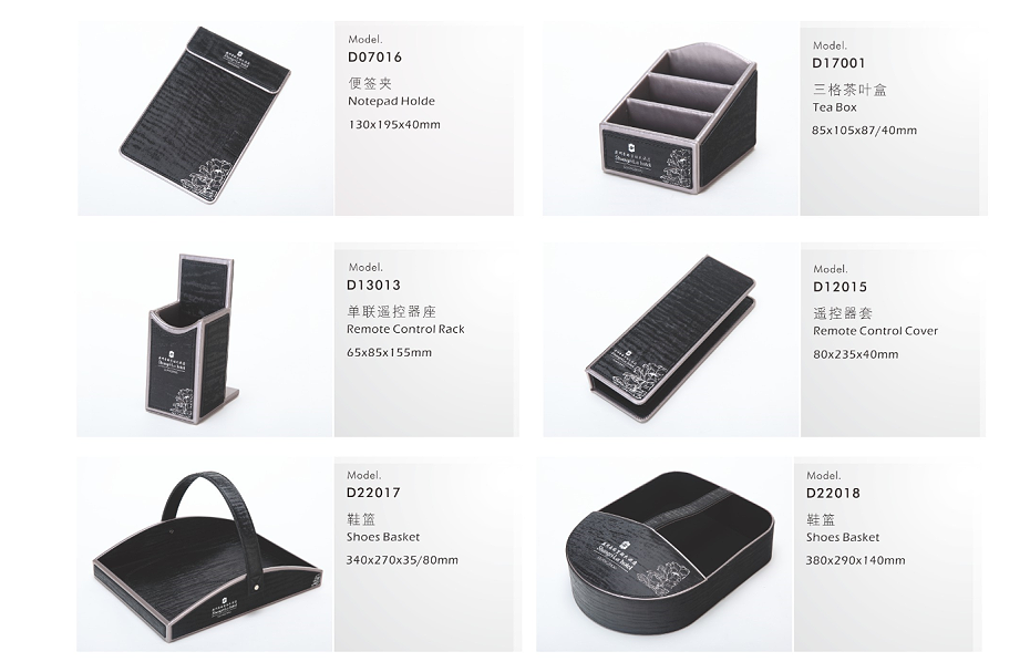 PRODUCTS:LEATHER GUESTROOM DIRECTORY, LEATHE NOTE PAD HOLDER, LEATHE SQUARE TISSEU BOX HOLDER, RECTANGLE TISSUE BOX HOLDER, LEATHER TRAY, LEATHER TEA BOX, LEATHER SHOE TRAY, LEATHER AMENITY TRAY, LEATHER MAGAZINE RACK, LEATHER ALARM CLOCK, LEATHE ICE BUCKET, LEATHER AMENITY BOX, LEATHER REMOTE CONTROLLER HOLDER, METAL DOUBLE WALL DUST BIN, LEATHER DUST BIN