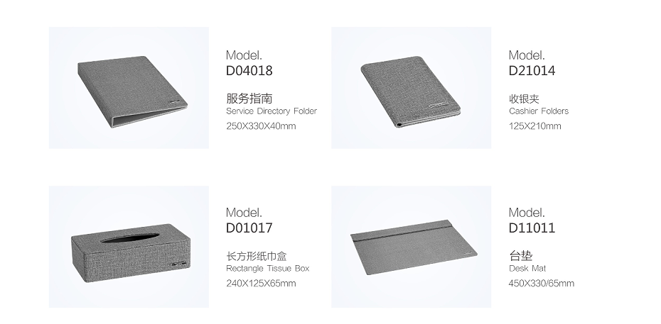 PRODUCTS:LEATHER FOLDER, LEATHER SERVICE DIRECTORY (WITH CLIPS), LEATHER RECTANGLE TISSUE BOX HOLDER, SQUARE TISSUE BOX HOLDER, LEATHER REMOTE CONTROLLER STAND & FOLDER, LEATHER TEA BOX, LEATHER SHOE TRAY, LEATHER CASHIER FOLDER, LEATHER BLOTTER, LEATHER AMENITY BOX, LEATHER STATIONARY BOX, NOTEPAD HOLDER, LEATHER DOOR KNOB (DO NOT DISTURB), LEATHER CONFERENCE PAD, LEATHER CUP MAT, LEATHER ICE BUCKET, LEATHER DUST BIN