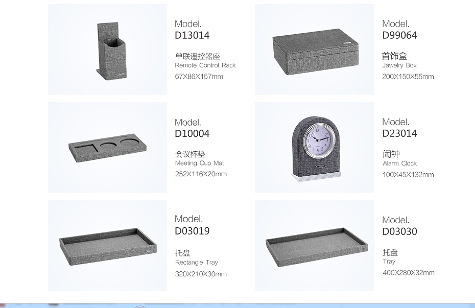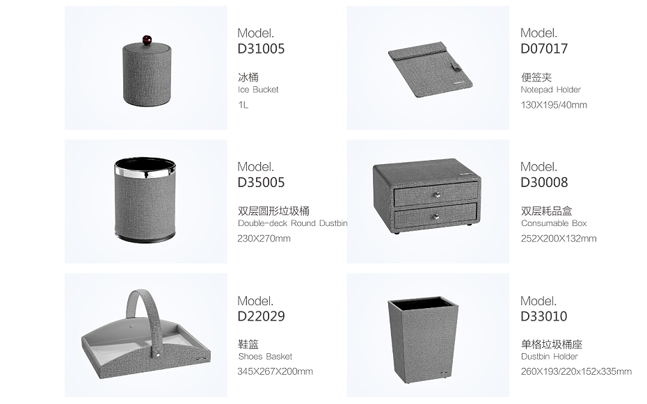 PRODUCTS:LEATHER GUESTROOM DIRECTORY, LEATHE NOTE PAD HOLDER, LEATHE SQUARE TISSEU BOX HOLDER, RECTANGLE TISSUE BOX HOLDER, LEATHER TRAY, LEATHER TEA BOX, LEATHER SHOE TRAY, LEATHER AMENITY TRAY, LEATHER MAGAZINE RACK, LEATHER ALARM CLOCK, LEATHE ICE BUCKET, LEATHER AMENITY BOX, LEATHER REMOTE CONTROLLER HOLDER, METAL DOUBLE WALL DUST BIN, LEATHER DUST BIN