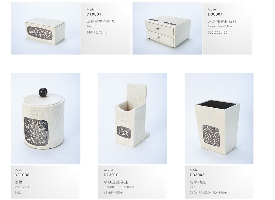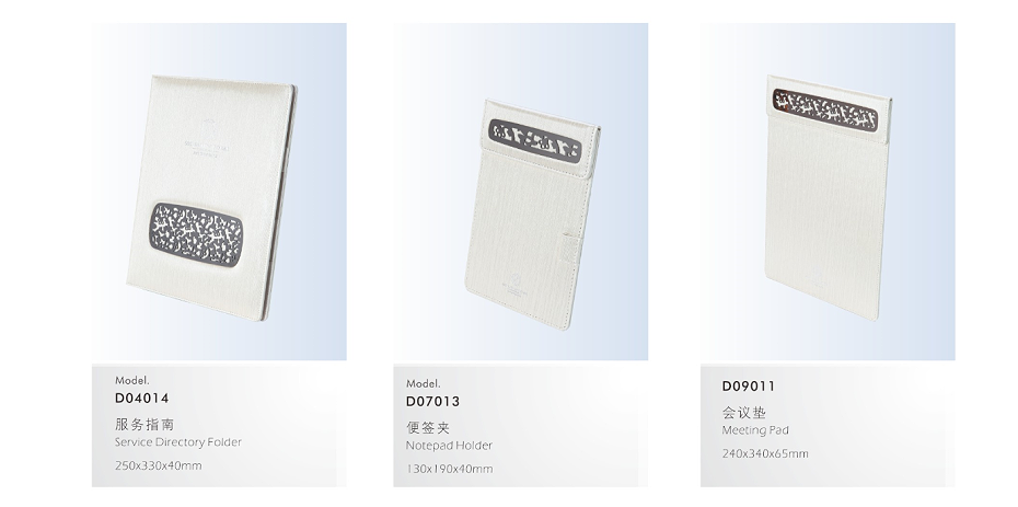 PRODUCTS:LEATHER FOLDER, LEATHER SERVICE DIRECTORY (WITH CLIPS), LEATHER RECTANGLE TISSUE BOX HOLDER, SQUARE TISSUE BOX HOLDER, LEATHER REMOTE CONTROLLER STAND & FOLDER, LEATHER TEA BOX, LEATHER SHOE TRAY, LEATHER CASHIER FOLDER, LEATHER BLOTTER, LEATHER AMENITY BOX, LEATHER STATIONARY BOX, NOTEPAD HOLDER, LEATHER DOOR KNOB (DO NOT DISTURB), LEATHER CONFERENCE PAD, LEATHER CUP MAT, LEATHER ICE BUCKET, LEATHER DUST BIN