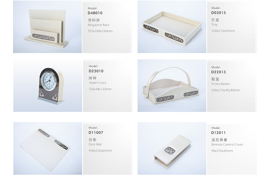 PRODUCTS:LEATHER FOLDER, LEATHER NOTE PAD HOLDER, LEATHER RECTANGLE TISSUE BOX HOLDER, SQUARE TISSUE BOX HOLDER, LEATHER REMOTE CONTROLLER HOLDER, LEATHER REMOTE CONTROLLER STAND, LEATHER BILL FOLDER, LEATHER CONFERENCE TEA CUP STAND, LEATHER SHOE TRAY, LEATHER AMENITY TRAY, LEATHER LAUNDRY BAG HOLDER, LEATHER BLOTTER, LEATHER CONFERENCE PAD, LEATHE ALARM CLOCK, LEATHER DUST BIN