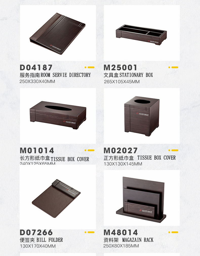 PRODUCTS:WOOD GUEST SERVICE DIRECTORY, WOOD STATIONARY BOX, WOOD RECTANGLE TISSUE BOX HOLDER, WOOD SQUARE TISSUE BOX HOLDER, WOOD NOTE PAD HOLDER, WOOD MAGAZINE RACK, WOOD REMOTE CONTROLLER HOLDER, WOOD SERVICE TRAY, WOOD SHOE BASKET, WOOD DUST BIN