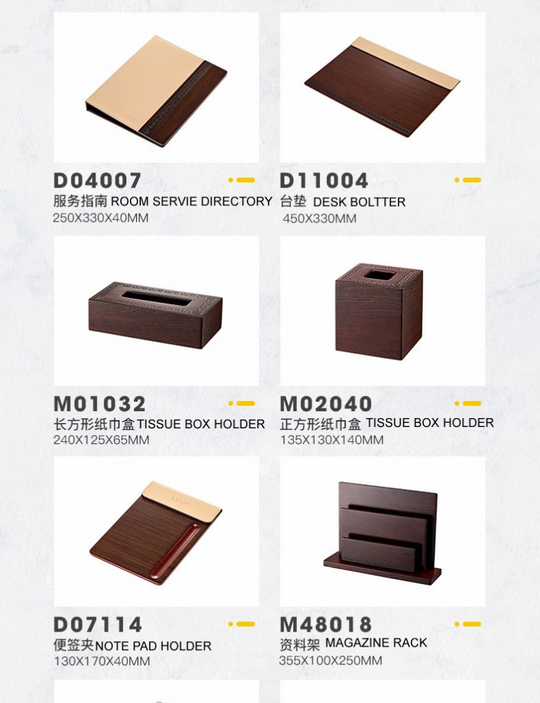 PRODUCTS:WOOD GUEST SERVIE DIRECTORY FOLDER, WOOD BLOTTER, WOOD RECTANGLE TISSUE BOX HOLDER, WOOD SQUARE TISSUE BOX HOLDER, WOOD NOTEPAD HOLDER, WOOD MAGAZINE RACK, WOOD BILL FOLDER, WOOD SERVICE DIRECTORY, WOOD DUST BIN, WOOD SHOE BASKET, WOOD SOAP DISH, WOOD TEA BOX, WOOD CUP PAD, WOOD AMENITY BOX, WOOD ALARM CLOCK, WOOD REMOTE CONTROLLER HOLDER