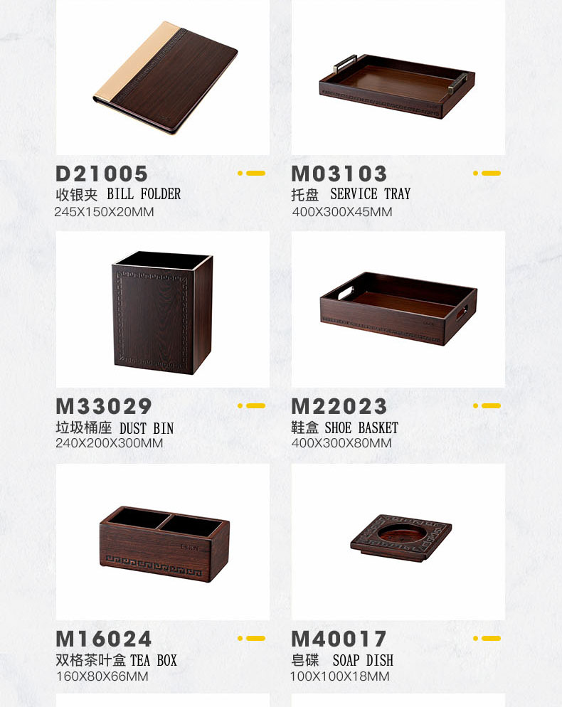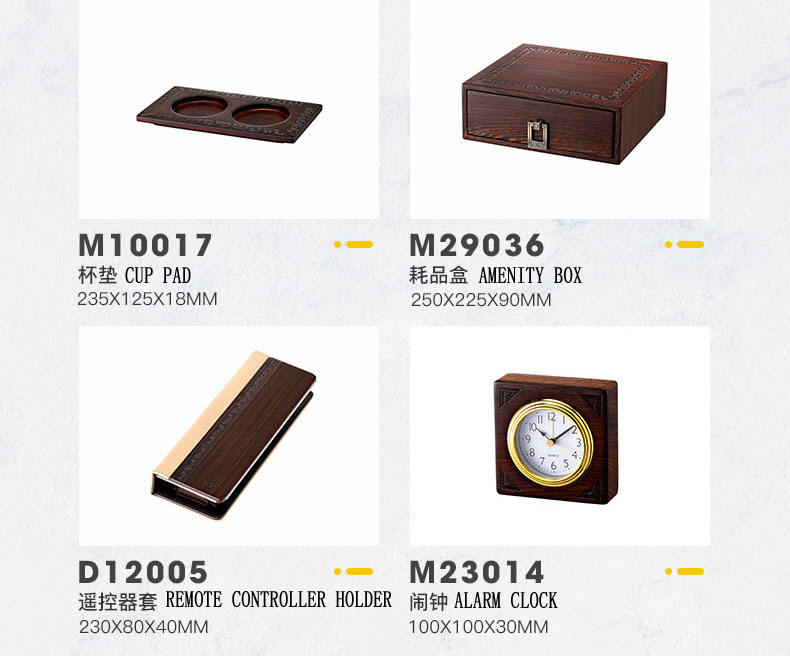 PRODUCTS:WOOD GUEST ROOM SERVICE DIRECTORY, WOOD CONFERENCE PAD, WOOD TISSUE BOX HOLDER, WOOD AMENITY DISPLAY, WOOD CANDY DISH, WOOD TEA BOX, WOOD REMOTE CONTROLLER HOLDER, WOOD TOWEL DISH, WOOD NO SMOKING SIGN, WOOD AMENITY TRAY, WOOD VASE, WOOD CUP MAT, WOOD ASH TRAY HOLDER, WOOD SIGN, WOOD MAGAZINE RACK, WOOD STATIONARY BOX, WOOD COAT BRUSH, WOOD SHOE HORN, WOOD SHOE BASKET, WOOD SERVICE TRAY, WOOD DUST BIN, WOOD ICE BUCKET HOLDER